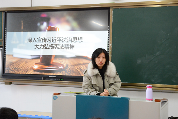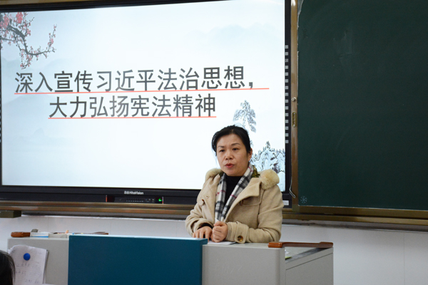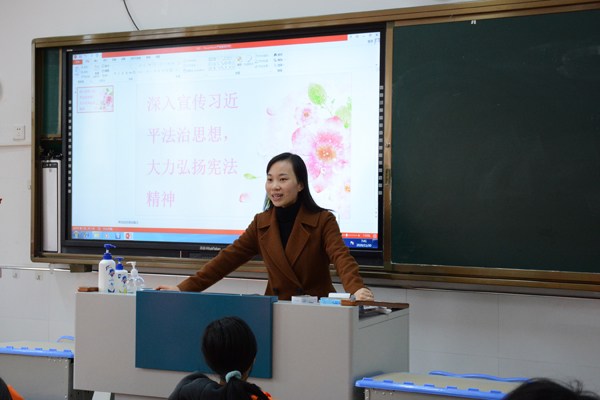 班会课上,在班主任的精心组织下,同学们学习了《中华人民共和国宪法》,重点学习了《中华人民共和国宪法》的地位与作用、目的意义以及国家根本制度和根本任务、国家的领导核心和指导思想、国体和政体、基本原则和精神等内容。随后,同学们上台谈学习想法、谈自身感悟。大家均谈到,宪法是国家的根本大法,作为学生,也该用宪法规范自己的行为。