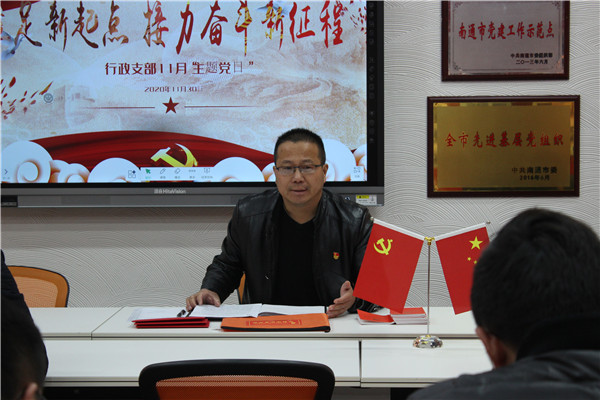 为深入学习贯彻党的十九届五中全会精神,11月30日16时,行政党支部在“砥砺厅”召开“立足新起点,接力奋斗新征程”主题党日活动。支部全体党员参加了此次活动,活动由支部书记洪龚明同志主持。活动共有五项议程。学校党委委员以普通党员身份参加党日活动。 理论学习 常学常新 支部书记洪龚明带领全体支部党员共同学习《中国共产党第十九届中央委员会第五次全体会议公报》。全会为未来五年和中长期发展擘画了宏伟蓝图。支部党员群情振奋,斗志昂扬,扎实落实会议精神,为学校领航发展和实现“十四五”规划奋勇前行。 政治生日 温暖加持 行政支部11月政治生日有三位同志,分别为宋健、施晓东和张舒皓,支部书记洪龚明为政治生日同志送上贺卡。宋健从自己对党员的理解角度谈了政治生日感受,并希望全体党员能不断学习、不断进步;张舒皓则从大学入党渊源谈起,联想到所有的幸福都是要靠自己奋斗,几位同志都是表示要常怀感恩之心,砥砺前行。 重温誓词 不忘初心 重温入党誓词环节由政治生日同志领誓。宋健和张舒皓带领全体支部党员紧握右拳,庄严宣誓。重温誓词也是每月主题党日必修课,在一次次宣誓声中不断叩问心灵,与党中央同频共振,保持高度统一。 感悟交流 真情流露 王勤荣、范丽萍和施黎华同志作为党员代表做感悟交流。三位同志结合本次理论学习中国共产党第十九届中央委员会第五次全体会议精神谈了自身感悟,并分享了平时工作、学习心得,三位同志均表示要用科学的理论武装自己,立足岗位、勇于担当奉献。 常规事宜 事无巨细 最后,洪龚明对党费交纳、学习强国学习、记实手册、谈心谈话布置等事宜进行提醒,随后全体党员填写记实手册内容,记录详实、规范。 主题党日是支部党员沟通交流的良好平台,全体党员可以借此机会学习分享、共同进步。支部党员必将充分利用好一月一次的学习交流机会,用红色引擎武装自己,厚积薄发。(供稿:党委办)