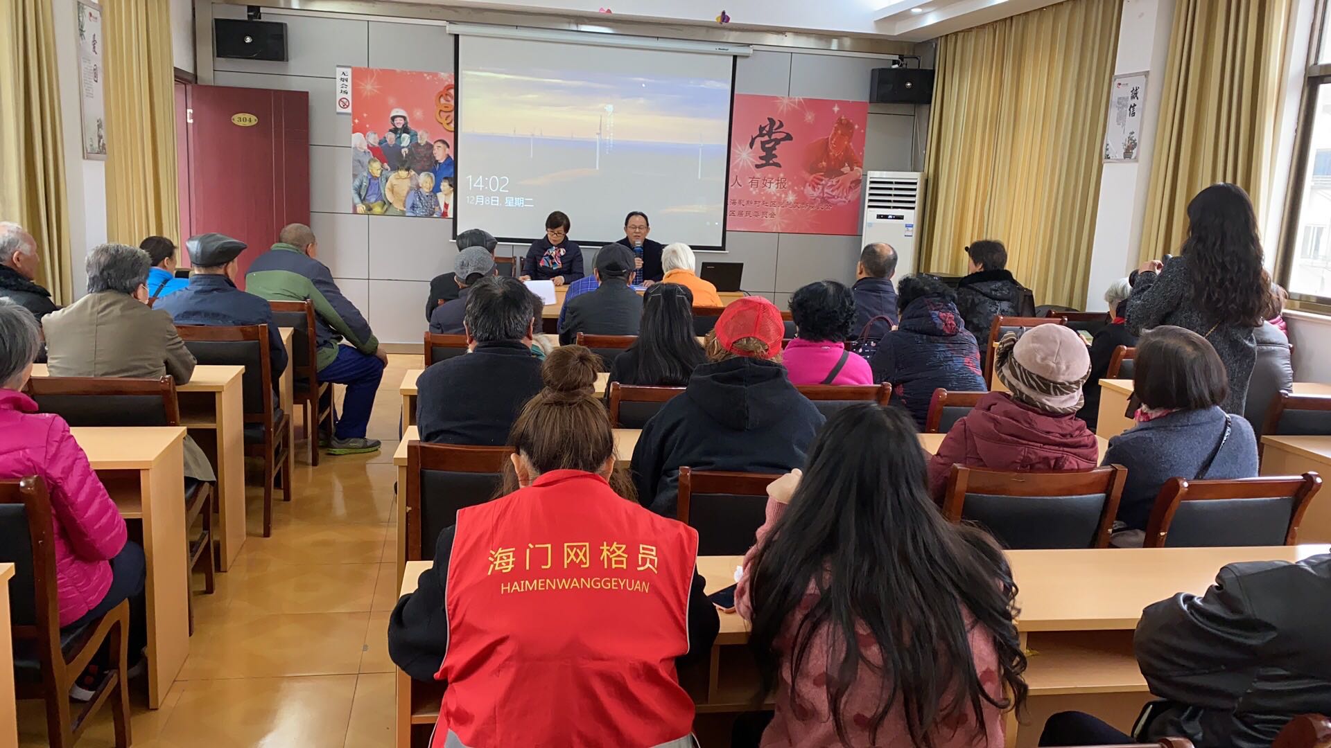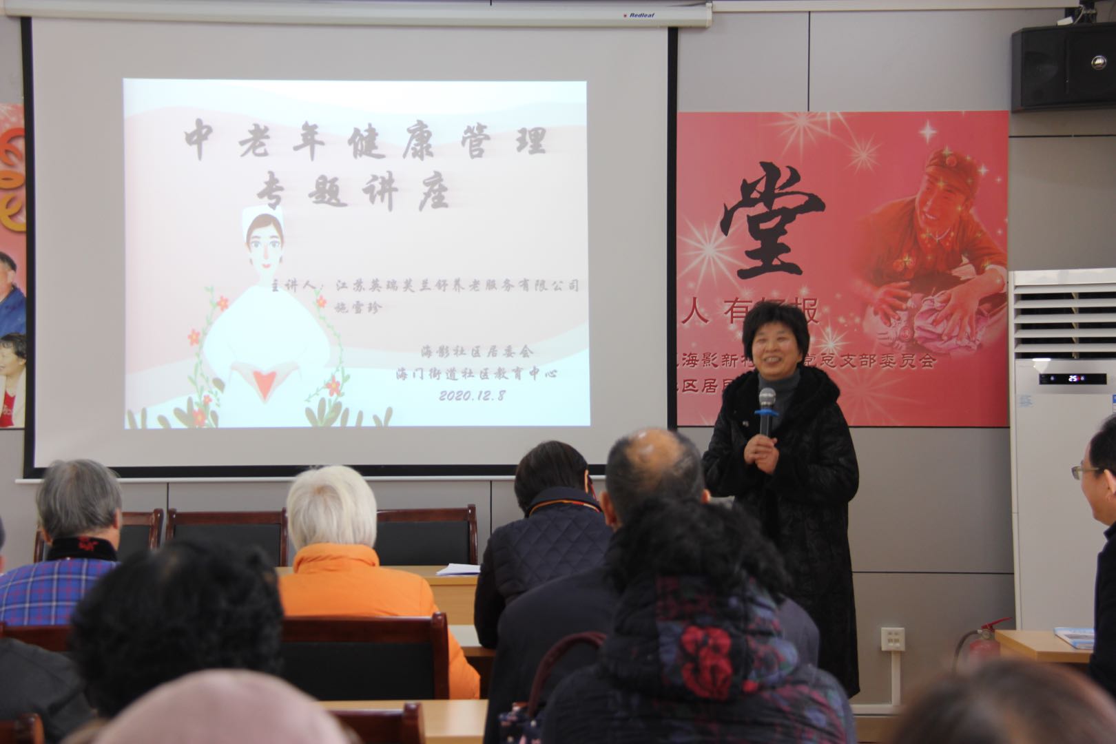 12月8日下午,海门街道社区教育中心联合海影社区居委会,在居民学校举办以“健康管理 尊严养老”为主题的中老年运动与健康专题讲座。来自海影社区的40多位楼长、居民代表聆听了江苏英瑞芙兰舒养老服务有限公司施雪珍的专题讲座。社区学院的部分领导、教师一起参加了这次活动。