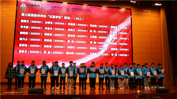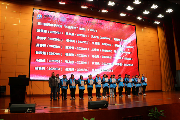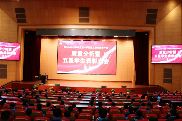 中南建筑产业学院2020-2021学年度第一学期第三阶段教学评价质量分析暨五星学生表彰大会,于12月22日在中南建设总部大楼三楼报告厅隆重举行,大会分为单招、委培两个专场。单招专场于中午召开,教学科研处副主任施黎华、单招班年级组长宋雅玲、2020级单招班级班主任及全体学生参加,党政办公室副主任沈晶晶主持。委培专场于下午召开,学工后勤处主任郁建菊、委培班年级组长杨海燕、2020级委培班级班主任及全体学生参加,由学工后勤处副主任王国华主持。 大会在庄严的国歌声中拉开帷幕,全体师生肃立,奏唱国歌。 第一项议程:质量分析。宋雅玲、杨海燕分别就第三阶段教学评价情况,以纵、横两向,从专项与整体作客观、细致的分析,并提出切实中肯的学习指导建议。 第二项议程:表彰宣读。施黎华、郁建菊分别宣读《关于表彰第三次阶段性教学评价“五星学生”的决定》。 第三项议程:颁奖激励。施黎华、郁建菊分别为五星学生颁发荣誉证书,并与学生合影留念。 第四项议程:总结砥砺。施黎华建议学生通过质量分析数据了解年级、班级整体学习情况,结合自身情况反思学习中的得与失,找到学习中的阻碍症结与提升方法。保持学习兴趣,坚定学习目标,探究学习方法,提升学习能力。郁建菊从衣、食、住、行四个方面对养成教育做了详尽、系统的阐述,结合学生实际探讨了坏习惯形成的原因及形成好习惯的方法,并将多年经验体会与学生分享,深入浅出、睿智风趣、富有哲理。 专场召开的教学评价质量分析暨五星学生表彰大会,针对单招班级和委培班级不同学生群体的学习生活现状和特点,对症下药,及时地调整学生思想认识,帮助学生认清存在的问题,再接再厉,会学习、勤作为、努力向前。