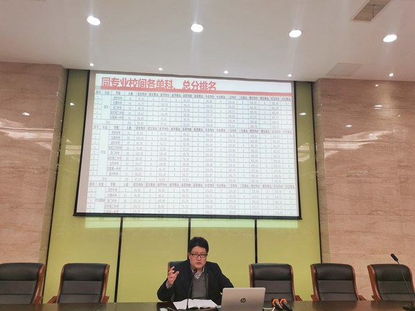 首先王主任对南通市一模考试情况进行重点分析,新鲜出炉的成绩最具说服力。他从系部、学校、南通大市级三个层面,从文化课、专业课两个类别,从本次考试、六校联考、往届同期三个时间维度,通过各专业同轨班级专业成绩、高分段人数的分布等不同角度的分析,剖析现状,指出问题。同时通报了全省各专业参考学生人数,让全体同学明确各专业的实际情况以及存在的差距。