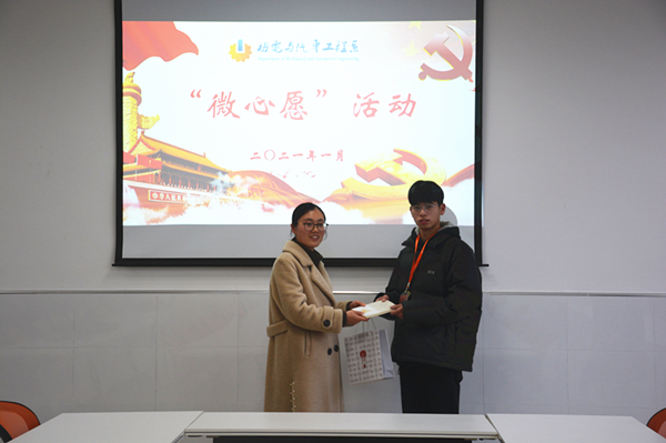 前期支部组织班主任在各班级中认真摸底,征集学生具体实在、真正需要、可行易行的微心愿,形成微心愿清单,发在党员学习群中认领,全体党员积极响应,争做圆梦人。最终确定18JD01班的姜佳杰和18JD04班的范学为两名同学作为微心愿对象。教师党员们为他们发放了学习用品、生活用品,鼓励他们好好学习,立志成才,在今后的人生道路上继续传递爱心、奉献社会。此次圆梦的学生表示要加倍努力学习,懂得感恩,不负学校的期望,将来成为对社会有用的人才。