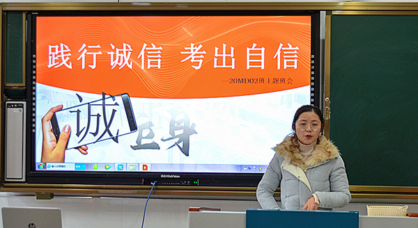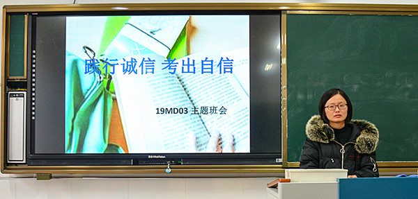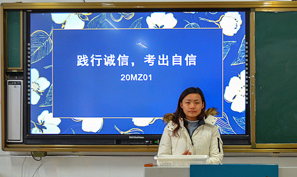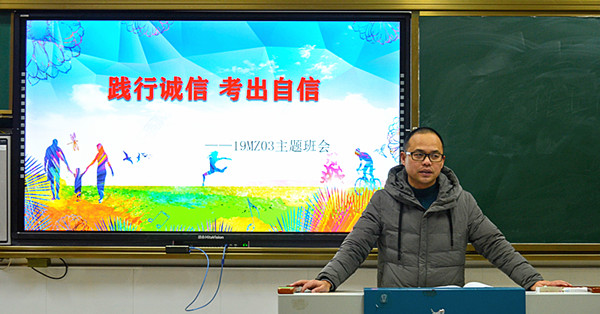 根据学校教学科研部安排,全体学生将于本月中下旬进行期末教学质量检测。为加强诚信教育,严肃考试纪律,提高考试质量,1月11日上午第一课,经贸系各班组织开展了“践行诚信 考出自信”主题班会活动。