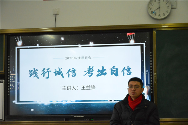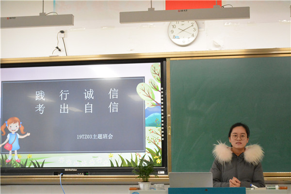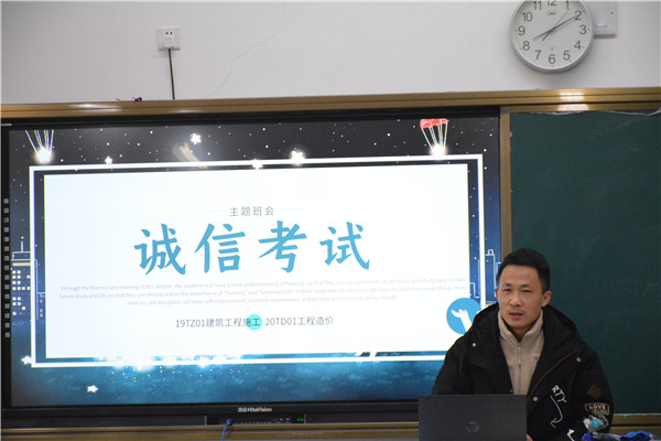 临近年关,期末考试也即将来临。为了全面贯彻落实考风考纪要求,加强诚信意识教育,塑造良好的道德品质,同时更好地指导同学们认真复习,做好迎考准备,建工系各班于1月11日上午第一节课组织开展了“践行诚信考出自信”的主题班会活动。