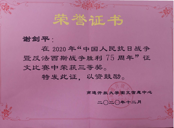 我校开放大学19春行政管理专科班学员谢剑平在南通开放大学举办的2020年“中国人民抗日战争暨反法西斯战争胜利75周年”征文比赛中荣获三等奖。