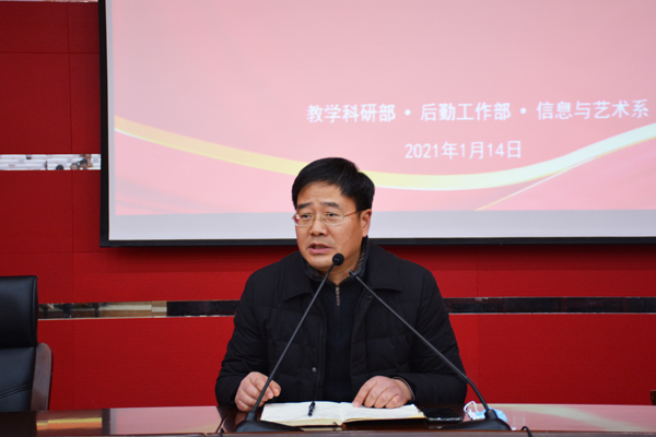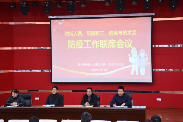 为深入贯彻落实各级相关疫情防控通知要求,做好冬春季各项疫情防控工作安排,切实筑牢校园安全,1月14日下午15:20,学校在H楼演艺报告厅组织召开了教辅人员、职员职工、信息与艺术系疫情防控工作联席会议。会议由教学科研部杨一丹主任主持,校党委委员、副校长周卫星、后勤保障部主任袁兵、信息系主任徐亮出席会议。