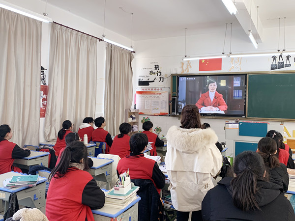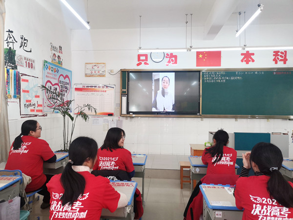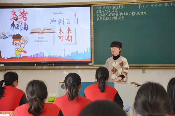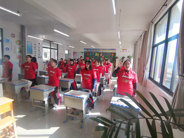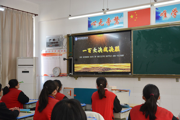 活动第二个阶段是分班级誓师活动。各班主任在主任室统一要求下,各显神通采用了各类活动形式,精心设计各种环节,组织本班学生进行活动。有的班级连线家长,通过视频为大家送来最具力量的鼓励和最美好的祝福;有的班级每一位学生将自己梦想本科院校的名称贴纸,仔仔细细贴在自己的课桌面上;有的班级精选歌曲《少年中国说》,高声齐唱为自己、为全班加油鼓劲……茅一娟副校长通过视频,为财贸全体高三学子作了热情洋溢的讲话。她鼓励大家不必犹豫,无需退缩,鼓起勇气,迎着朝阳,走过艰难,走过挫折,苦战100天,迎接希望,圆大学梦想。