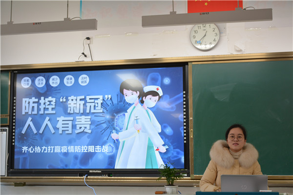 目前全国的疫情防控形式依然严峻,临近年关更是给防控带来了重重困难。班会课上,班主任给同学们说明了当前的防控形式,传达了各级部门对疫情防控工作的各项规程;对同学们在期末、寒假期间的防疫提出了明确的要求,做到“六个严禁”、“三个减少”、“六个坚持”。同时要求同学们跟亲人长辈做好宣传普及工作,不能对疫情有丝毫松懈,号召大家少外出,少聚集,平安渡过疫情时期。