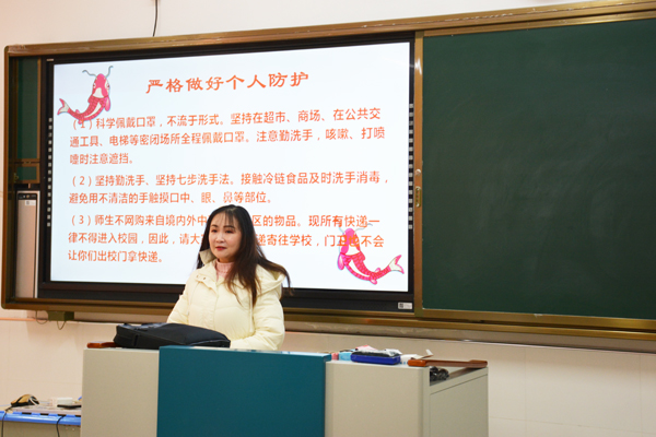 班会课上,班主任们首先分析了当前疫情防控的严峻形势,要求各位学生将身体健康和生命安全放在首位,按照防控要求,克服一切困难,认真做好防疫工作。随后从七个方面对疫情防控做了具体要求,即:明确六个严禁;做到五个彻底清楚;做好五件事;做到7个必须;做到4个严格;做到4个精准;提倡师生就地过节。同时班主任还要求全体学生强化防控意识的同时做好一名宣传员,把严格防控的要求传达给家长和周围的亲朋好友。