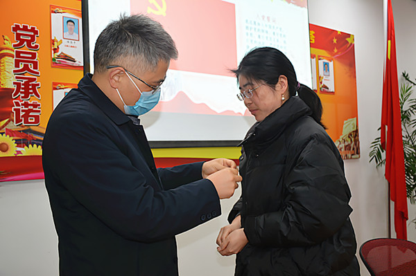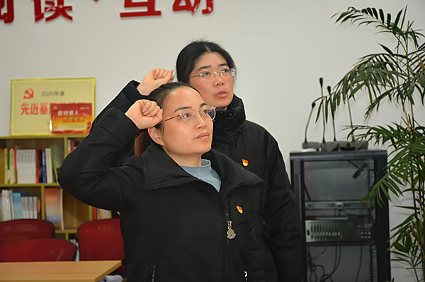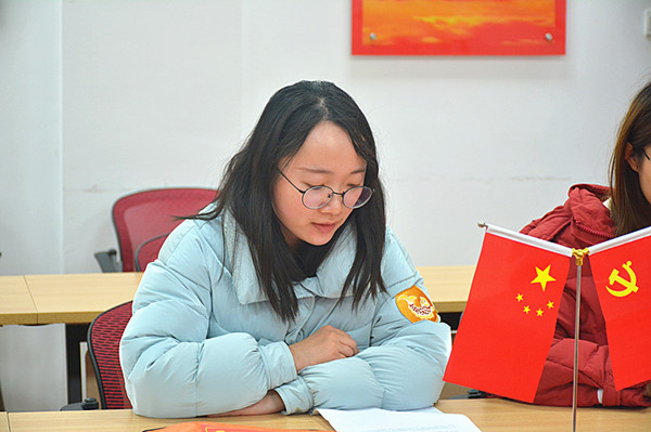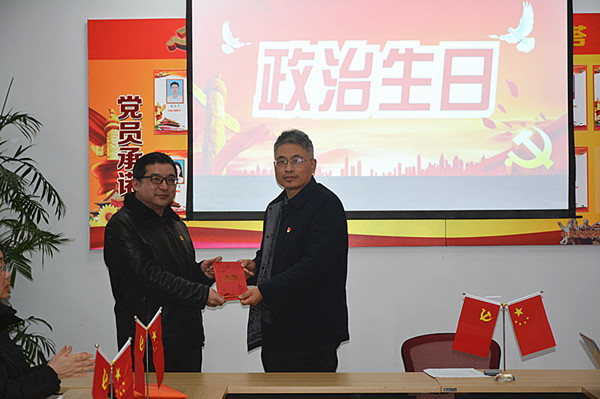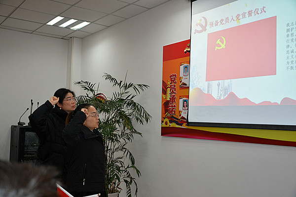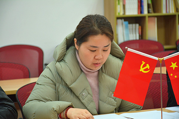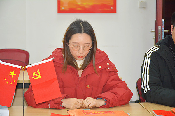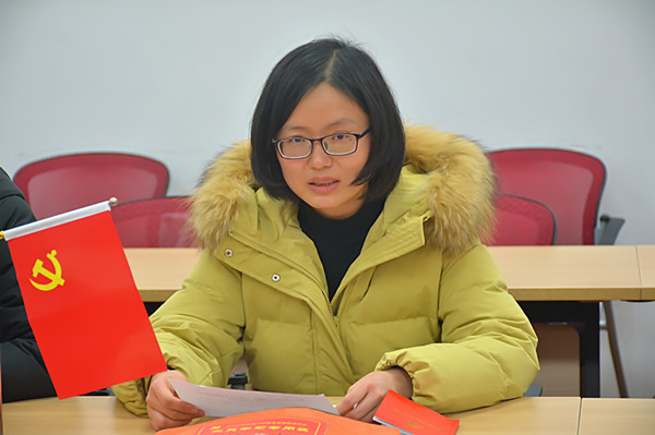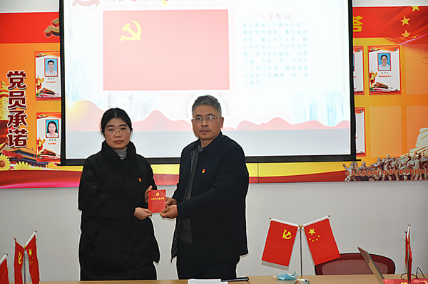 第三个议程:施红华同志入党宣誓仪式。首先校党委副书记周桂岐同志为施红华同志佩党徽、授党章,欢迎施红华同志加入党组织。鲜红的党旗,激昂的歌声,渲染出庄重的气氛。随后支部委员黄磊鑫同志带领施红华同志面向党旗庄严宣誓,表达对党的忠诚和为共产主义事业奋斗终身的决心。宣誓仪式结束后,大家对新党员表示祝贺,并寄予希望,希望她不忘初心、牢记使命,认真学习贯彻习近平新时代中国特色社会主义思想,立足本职、扎实工作,为学校发展作出更大的贡献。