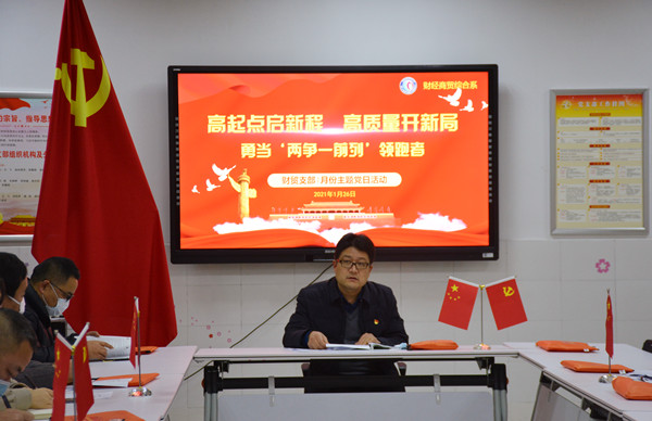 根据海门区委组织部和区委教育工委通知要求,在学校党委统一部署下,财贸系党支部于1月26日上午09:10,在謇公楼226会议室组织开展了1月份“主题党日”活动。本次活动以“高起点启新程,高质量开新局,勇当‘两争一前列’领跑者”为主题,由支部书记王飞同志主持,共包括六个议程。