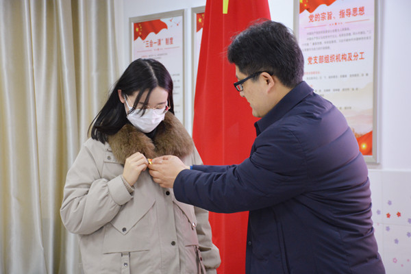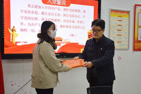 第五个议程是杨滨榕同志的入党宣誓仪式。在参会的正式党员的见证下,王书记带领杨滨榕同志庄严宣誓,并佩戴党徽、发放党员学习专用袋。同时王书记也提出了几点期望和建议。杨滨榕同志表示将继续坚守合格党员的四有标准,从政治上、组织上、思想上、行动上,努力争做一名优秀的共产党员。