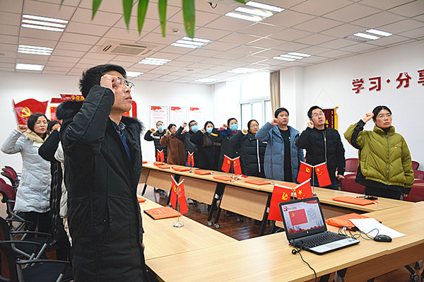 第三个议程:重温入党誓词。“我志愿加入中国共产党,拥护党的纲领......”对每一位共产党员来说,从宣誓的那一天起,生命便被赋予了新的意义。重温入党誓词,正是要再一次提醒在场的每位同志不忘党员身份,不忘光荣使命、不负神圣职责。