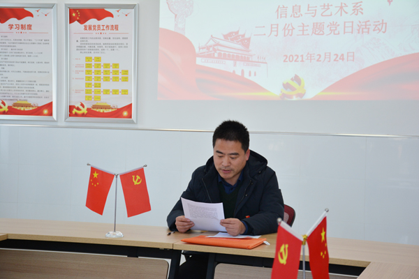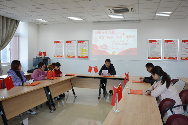 2月24日下午15:20,在信息党员活动室,信息与艺术系全体党员开展以“凝聚奋斗力量,勇当‘两争一前列’领跑者”为主题的2月份主题党日活动。活动由支部书记徐亮主持,活动共分三个议程。