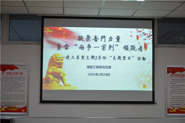 2月24日下午15:20,建工系党支部在B2-214党员活动室开展“凝聚奋斗力量,勇当‘两争一前列’领跑者”主题党日活动。活动由支部书记朱敏敏主持,共分四项议程。