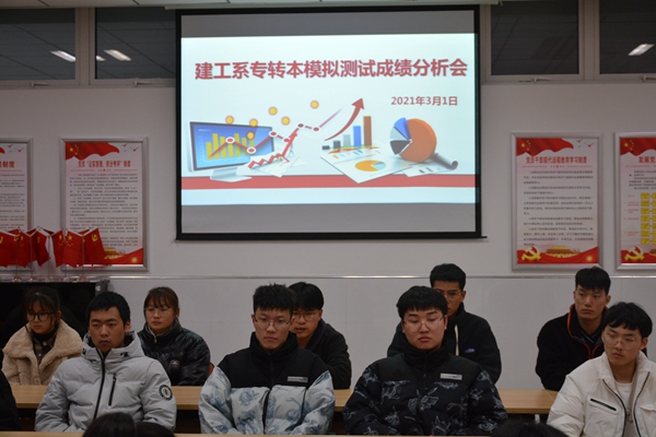 3月1日下午大课间,建工系在214会议室召开专转本模拟测试成绩分析会,系办朱敏敏主任、张永辉副主任、龚婷婷、黄杨、黄磊、张慧琴和缪晨烨等教师及专转本班全体学生参加了会议。