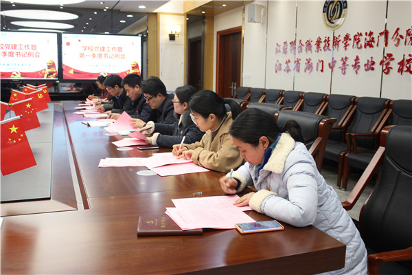 3月5日下午2点30分,海门中专党委在图文信息大楼百度厅召开学校党建工作暨第一季度支部书记例会,学校党委办、宣传办、工会人员及各支部书记参加了本次会议。会议由学校党委书记宋健主持。 首先,党委书记宋健提出总体要求。他先从宏观上总体梳理各部门职责,要求学校党委办、宣传办和工会三个部门联动,各支部高度参与配合,确保2021年党委工作目标任务和上级各项部署顺利完成,要求各部、系积极促进党建与业务融合,构建学校“大党建”格局。 其次,党委办主任洪龚明就本学期党建工作进行具体部署。洪龚明从“党务规范化”和“建党100周年纪念教育活动”两大任务入手,要求各支部继续做好基层支部规范化建设的同时,积极参与建党100周年纪念活动,通过十个项目“致敬红色百年”,积极推动学校“名特优”党建品牌内涵化发展。 工会主席肖冰阐述了工会经费申请使用具体事宜,从申请权限、申请程序、经费标准、经费报支程序等方面进行细致解读,本着“合理、合法、合规”原则,使学校工会经费管理工作合标准、上规矩。 随后,宋健用“八个一”阐述了学校党建工作具体抓手:常规工作一如既往、党建规范一以贯之、书记清单一着不让、重点工作一呼百应、关键项目一丝不苟、领航任务一往无前、先锋引领一马当先和台账资料一应俱全。为学校新一年党建工作指明了方向。 会议最后,全体支部书记现场签订了海门中专系部(学院)党建工作目标责任书和全面从严治党责任书。(供稿:党委办)