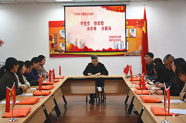3月23日下午15:20,经贸系党支部在C2-209党员活动室开展“学党史、悟思想、办实事、开新局”主题党日活动。校党委副书记、副校长周桂岐及全体党员参加了本次活动。