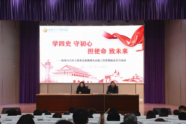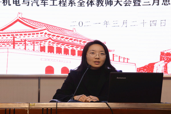 3月24日15:30,机电系在文苑楼报告厅召开以“学四史 守初心 担使命 致未来”为主题的全体教师大会暨三月思想政治学习活动。机电系副主任黄引主持会议,机电系主任吴樱樱出席会议并讲话。会议共三项议程。
