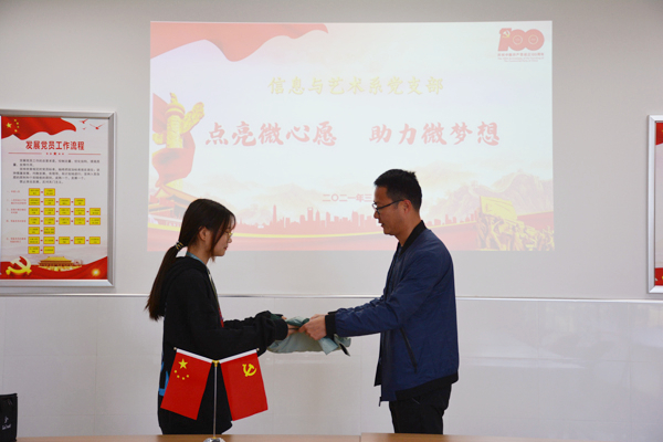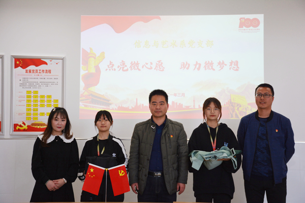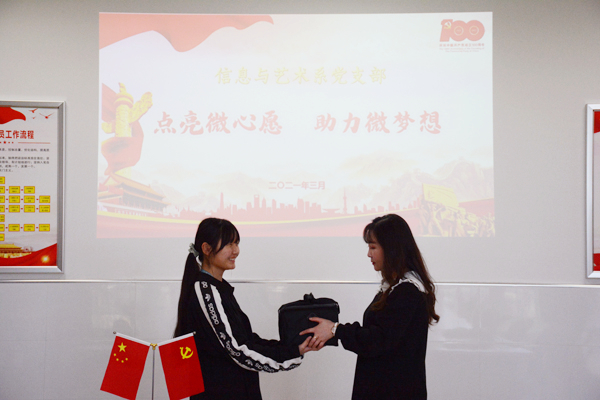 3月25日下午14:30,信息与艺术系党支部在全体党员中广泛开展了“凝聚微力量,点亮微心愿”活动,开展了党员教师送温暖、助力贫困学生圆梦的“微心愿”活动,为系部两名特困学生送上支部党员们捐赠的物品。