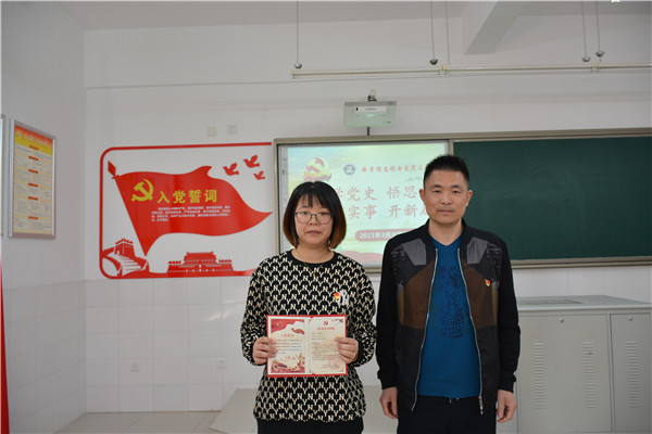 支部党员张淑琴、张成两位同志就党史学习进行交流。张淑琴说:“作为一名党员教师,我们要学党史、办实事,牢记党的历史经验,立足本职工作,用自己的行动在教育岗位上发光发热”。张成说:“敬党、爱党的前提就是深入了解党史,以革命前辈的历史经验作为工作的行动指标,不忘初心,牢记使命,砥砺前行。”