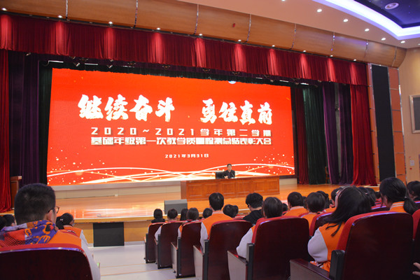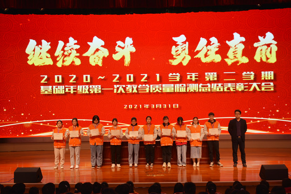 本学期第一次质量检测已圆满完成。为表彰模范、鼓舞斗志,营造良好的学习氛围,3月31日下午15:30,财贸系在謇公湖科教大会堂召开基础年级第一次教学质量检测总结表彰大会。19、20级全体同学及班主任参加了本次会议,会议由王飞主任主持并主讲。