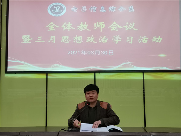 3月30日上午9:15分,电信系在E楼大师报告厅召开了全体教师会议暨三月份思想政治学习活动,江勇主任在会议上发言。