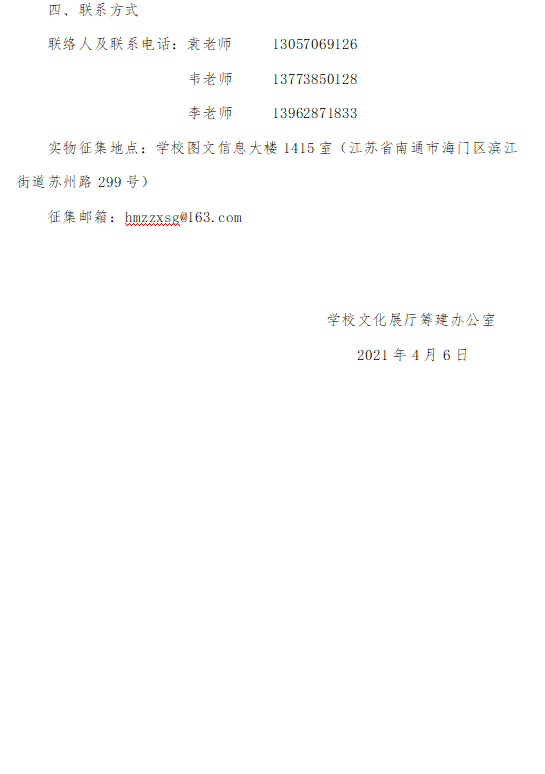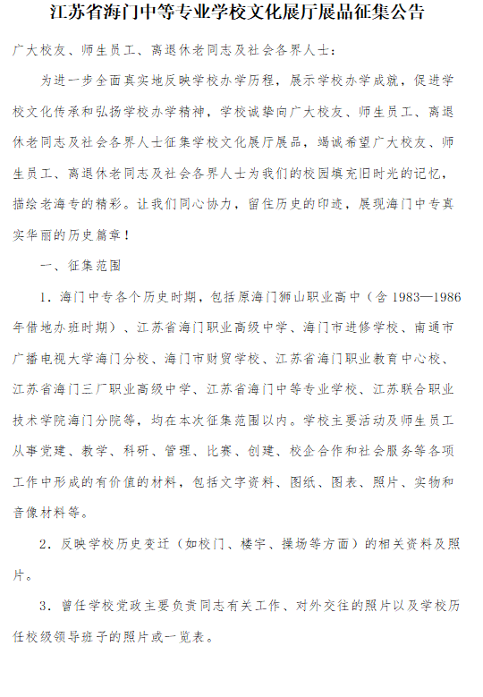 江苏省海门中等专业学校文化展厅展品征集公告