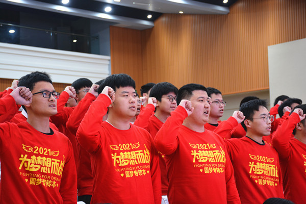 第一项议程,专转本全体学生共同唱响战斗誓言。铮铮誓言响起:唤醒潜能,凝聚力量;挥洒青春,全速启航;信心百倍,斗志昂扬;破釜沉舟,铸造辉煌!光荣与梦想在这里延伸……
