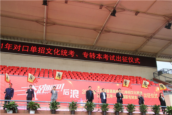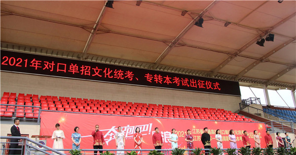 三年梦想,一朝决胜!4月21日上午,海门中专2021年对口高考、专转本出征仪式在南操场举行。531名对口单招考生、162名专转本考生一同接受了来自师生、家长的祝福。 海门区教体局副局长曹慧忠、职社科科长顾靖锋、副科长马建国,海门中专校长徐忠、党委书记宋健等学校领导班子成员,全校7000多名师生一起参加了出征仪式。另有部分考生家长们来到现场,送上鼓励和祝愿,见证同学们人生中的重要时刻。 仪式现场,鲜花福袋,寄托全心全意的期盼;横幅标语、励志氛围浓郁;彩旗飘摇、战鼓擂响,让人备感振奋;学弟学妹夹道欢送,传递心的共鸣;视频回望,记录高中三年多少难忘瞬间…… 与往年相比,今年的出征仪式有着诸多“不同”。 不同之一:老师们的祝福寄语,很专业。 机械老师:“考试其实就是一次热处理,希望高考能把你们打造得和钢一样强!”; 服装老师:“ 一针一线,精益求精出华服……祝愿全体考生为自己编织出最美好的未来!” ; 电子电工老师:“希望同学们全力开动小马达,接通所有电路,点亮理想的灯”; 建筑老师:“一砖一瓦筑成高楼大厦,一卷一题成就美好未来!”; …… 不同之二:生日赶上高考出征,很温馨。 财贸系的俞佳辰同学,说:一个特别意义的时刻,一定会让我的高考超常发挥。 电信系汤佳铖同学的家长,说:这样的特别日子,这样的一个活动,让我们家长感觉既震撼又温馨……今天我送出的生日礼物,是一本笔记本、一个书签和一支笔。本子上的一句话,送给汤佳铖,送给所有的孩子:最后一战,为梦想而战。 不同之三:7000师生参与出征,很隆重。 “对口高考文化统考” 出征仪式与“专转本”出征仪式,一起举行,这是学校首次。规模大、涉及人员多,史上未有。据悉,4月25日,531名对口单招考生、162名专转本,将奔赴考场,迎接考试。 仪式现场,作为“大家长”,校长徐忠对同学们有许多叮咛与期待。 徐忠在讲话中勉励2021年对口高考、专转本的同学们:“回首往事,大家一定会记得自己努力拼搏、全力付出的这段人生历程。你会铭记,你信心满满的模样,你高声宣誓的模样,你专注做题的模样,你反复操练的模样,你大声背书的模样,你用心聆听的模样……正是这个年纪该有的、最美的模样!” 徐忠还向全体考生授予“备考秘籍”:调整生物钟,提前进角色;审题别偷懒,难题先跳过。相信第一感,改动需谨慎;步骤写清楚,字迹要工整。答题要规范,时间巧安排;心态放平和,自信最重要。 随后,曹慧忠、徐忠为六大系部授旗。 曹慧忠为考生们送上三句话:一是以激情引爆潜能;二是以自信实现梦想;三是以成功创造未来。最后,他预祝同学们金榜题名、马到成功!? 最后,同学们庄严宣誓。“我们信心百倍,扬帆起航;我们意气风发,乘风破浪……“ 誓言在校园上空回荡,记录下这激情澎湃的青春岁月……