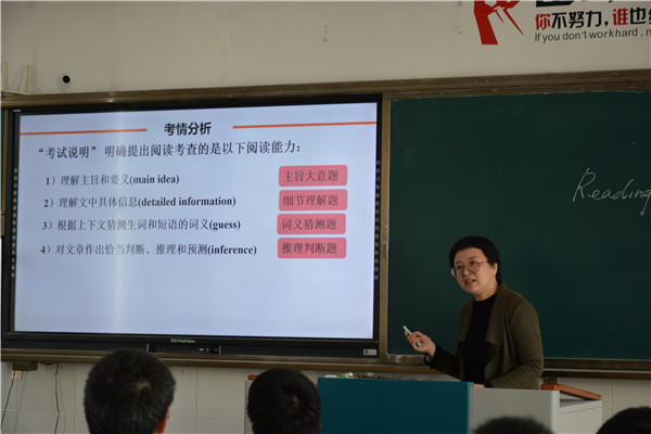 严丽敏老师认真钻研高考考纲,首先通过考情分析,突出阅读理解在高考中的占比,引起学生的重视。随后通过数据对比,让学生明确细节理解题在高考中的占比达72%。严老师精心挑选高考真题,引导学生掌握各种题型,最重要的是各种解题技巧,学生们犹如拿到了“解题法宝,加分秘籍”,激发了学生的学习热情,使学生积极参与教学活动中。