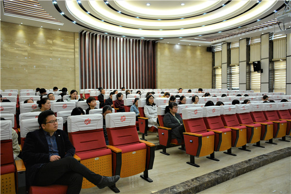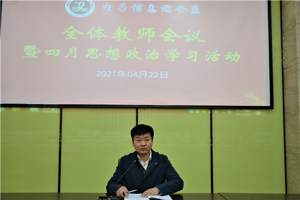 4月22日上午9:15分,电信系在E楼大师报告厅召开了全体教师会议暨四月份思想政治学习活动,江勇主任在会议上发言。