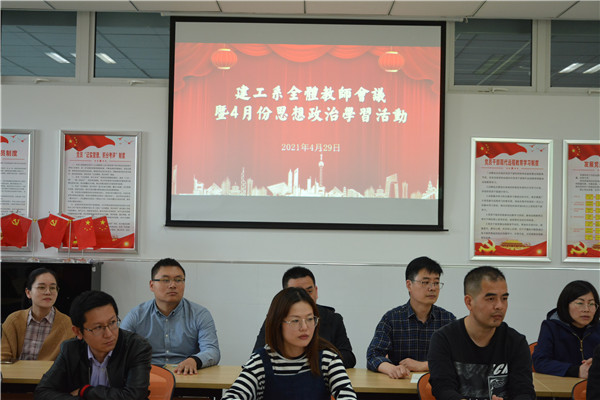 为进一步加强系部日常管理,4月29日下午15:15,建工系组织召开了系部全体教师会议暨4月份思想政治学习活动,建工系全体教师参加了本次会议,会议由朱敏敏主任主持。