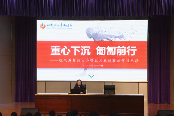 学期过半,为推动系部各项工作扎实开展,进一步强化全体教师守正创新意识,优化教育教学成果,5月11日上午10点,机电系在文苑楼报告厅召开全体教师大会暨5月思想政治学习活动。机电系主任吴樱樱主持会议,落实常规,明确要求,指出努力方向。