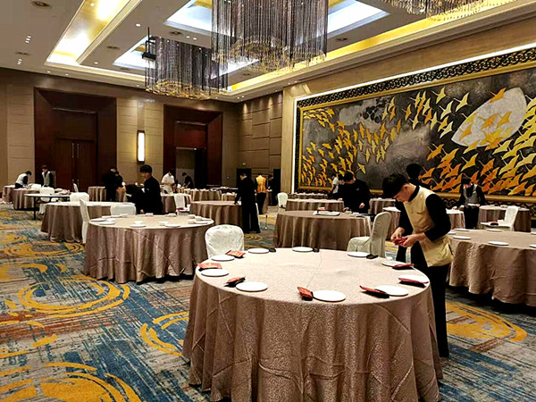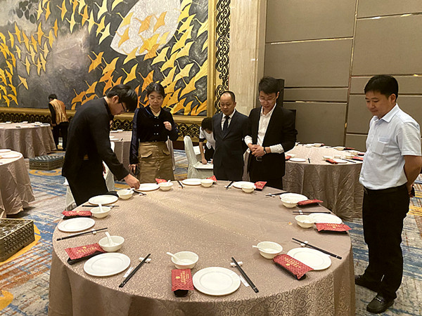 宴会摆台是以中餐宴会十人台摆台为考核内容,对学生铺台布、摆椅子、摆放餐碟碗筷、餐巾折花等环节逐一进行打分,从仪容仪表、行动举止、操作技巧、餐具定位等多个方面对学生进行综合评定。