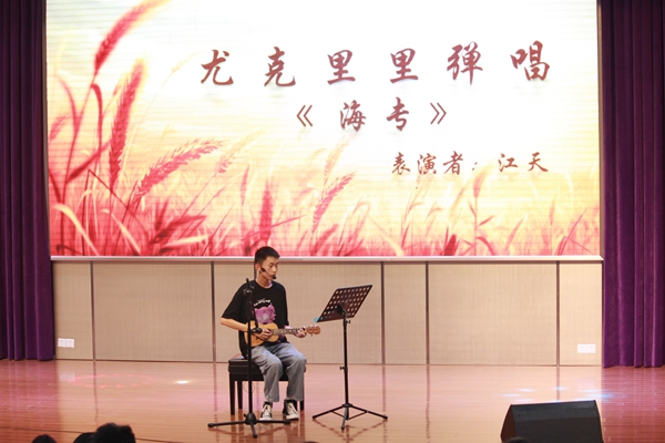 17级的同学们即将离开校园,进入见习阶段。19TD01班的姚颖钰同学作为代表,以《感恩青春有你》为话题说出了对17学长学姐们的不舍与鼓励,希望他们在今后的道路上越走越好,一往直前。接下来,又由江天同学带来尤克里里演奏《海专》,再一次勾起了大家的回忆。