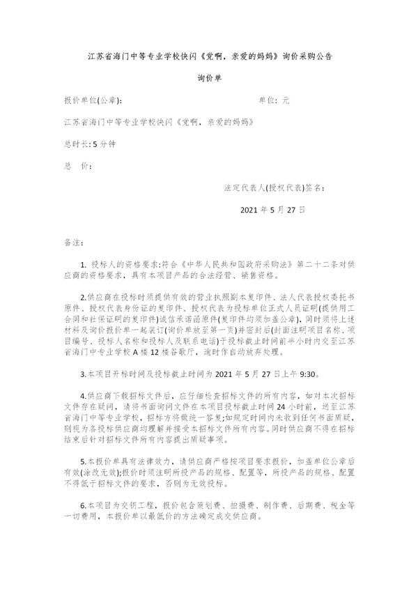 江苏省海门中等专业学校快闪《党啊,亲爱的妈妈》询价采购公告询价单