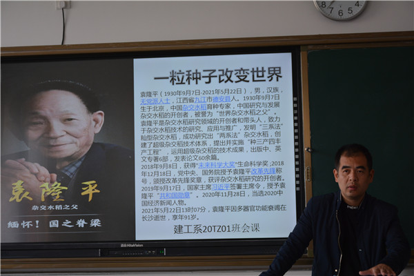 2021年5月22日,一个噩耗传到了世人的耳中:“杂交水稻之父”、“共和国勋章”获得者袁隆平,因多器官功能衰竭,于2021年5月22日13时07分在长沙逝世,享年91岁。为纪念袁隆平先生,回顾他对中国、全世界人民作出的卓越贡献,建工系组织各班开展“一粒种子改变世界”为主题的班会活动。