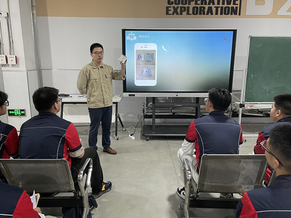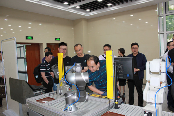 苏州海翌智能科技有限公司更是带来了一整套工业机器人实训装备,赚足了与会人员的眼球。公司研发部主管吴俊趁热打铁,作了题为《智能制造类专业实训基地建设思路与分享》的讲座。他从智能制造教育行业背景、智能制造实训建设目标、智能制造课程体系、智能制造专业技能操作设备等方面擘画了职业院校智能制造专业的秀美蓝图。吴俊还简要介绍了海翌智能科技有限公司生产的工业机器人拆装与维护实训平台、工业机器人虚拟仿真实训平台、工业互联网考核认真平台,列出了与该公司合作的诸多学校以及相应产品。工业机器人的确为本次研讨活动注入了活力,带领与会人员走近了科技的前沿。