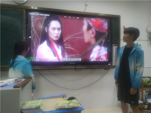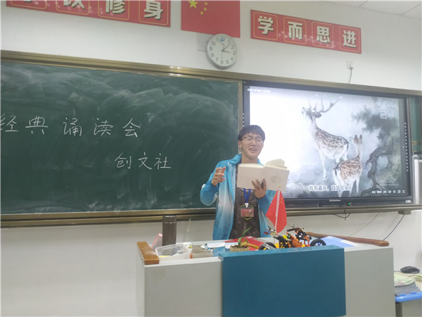 在精美的视频和悠扬的配乐声中,同学们分别诵读了《诗经》中的《关雎》、《汉广》、《鹿鸣》等篇目。《诗经》是我国最早的诗歌总集,语言质朴,情感充沛,学习《诗经》有助于学生更好地理解中国文化,感受中国渊深的文化历史。经典诵读之后,同学们又分小组进行了经典影视配音活动,同学们不但享受到了活动的乐趣,也加深了对作品和人物的理解。