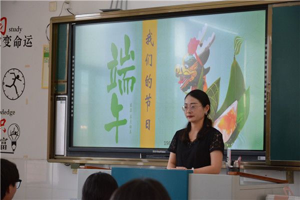端午节作为中华民族的传统佳节,它蕴含了我们民族的许多社会文化内容和历史文化内容。课上,师生共同探讨了端午节的来历;回忆了端午节的各种习俗;一起讨论了蕴含在佳节背后的文化意义。学生们从端午的习俗中了解了伟大的爱国诗人屈原、从各项民俗活动中感受到了历代人们对于幸福生活的不懈追求。课堂展示了各地丰富多彩的庆祝端午的活动图片,学生们从中感受到了赛龙舟的热烈、端午粽的美好......各项精彩绝伦的活动使学生们体验到了中华文化的博大精深、看到了中国人民的心灵手巧,从而从心底里产生了强烈的民族自豪感。