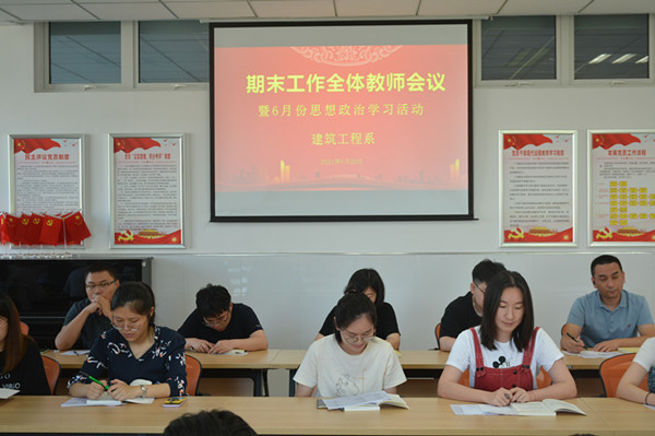 为全面总结点评本学期的各项工作,安排部署期末阶段各项重点任务,6月20日下午3点50分,建工系在B2楼214会议室组织召开了期末工作全体教师会议暨6月份思想政治学习活动。会议由系主任朱敏敏主持。