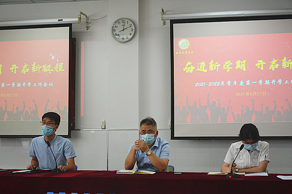 随后,学校副书记、副校长周桂岐进行了指导讲话。周校长由三个方面一一道来:一、做实疫情防控;二、做优学生管理;三、做强专业内涵。周校长用生动精辟的话语为全体老师新学期的工作进行了详实的业务指导。