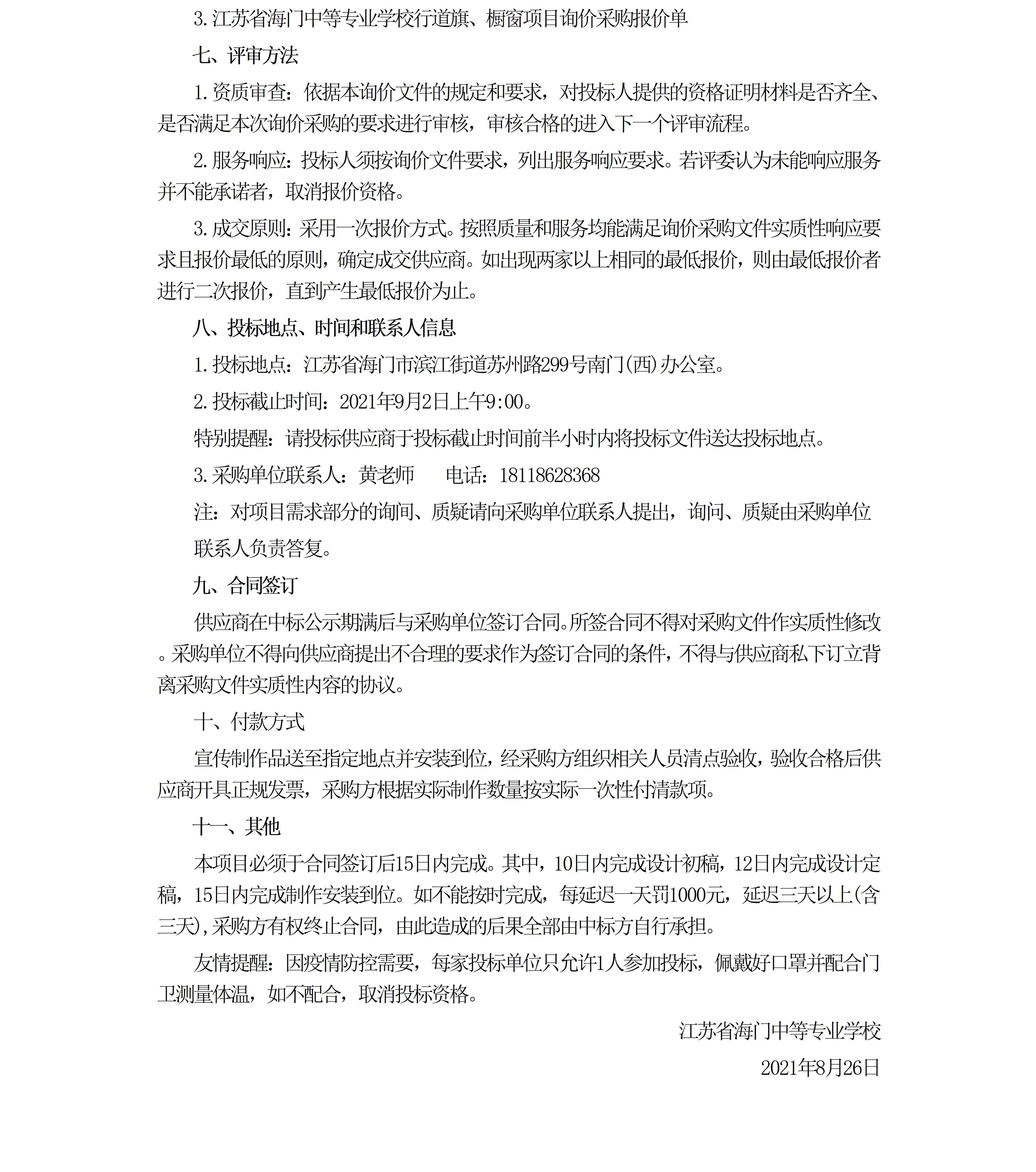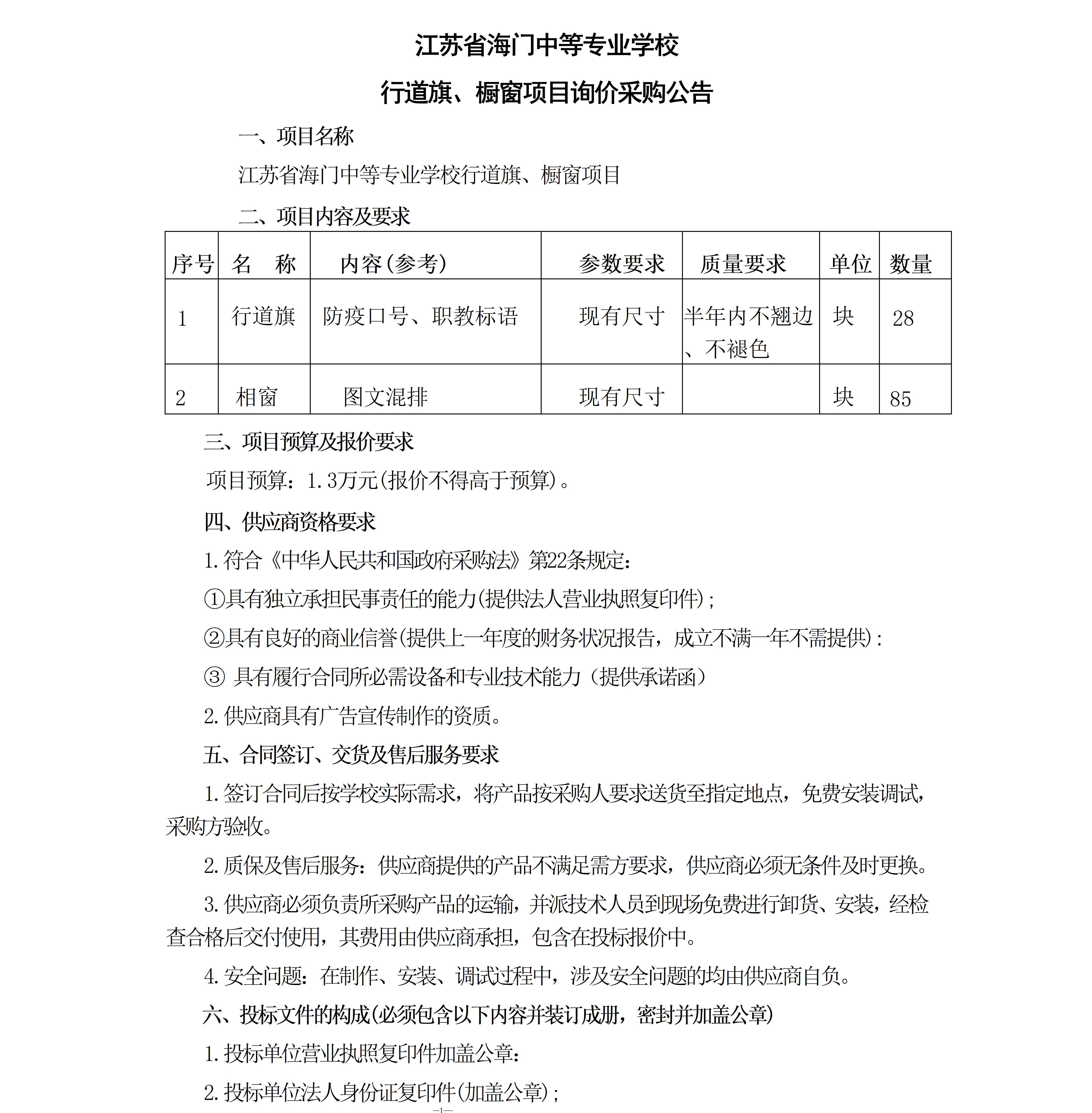 江苏省海门中等专业学校 行道旗、橱窗项目询价采购公告