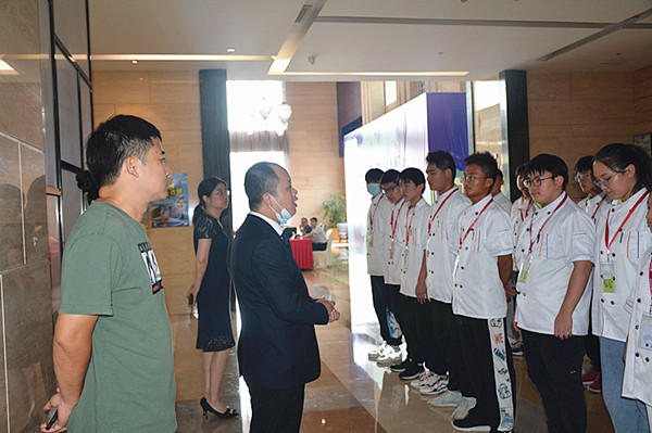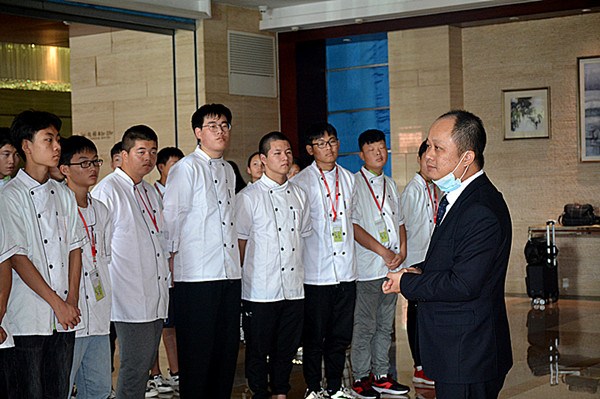 参观的最后,酒店陈焕智经理还与学生们进行了现场亲切交流,询问学生的家庭、喜好、工作要求等情况,关怀之情溢于言表,酒店大厅其乐融融。