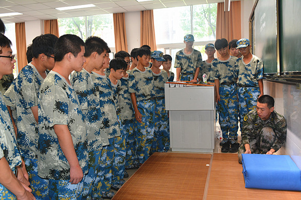 军训另一项目内务整理,最难上手的应该要算叠被子了。教官在教室里亲自示范,就被子折叠的尺寸、虚部掏实、压平、两次对折等手法都做了一一讲解,当学生们看到不成形的被子在教官的手中变成了有棱有角的“豆腐块”时,他们惊讶、敬佩,同时也平添了叠好被子的渴望与信心。