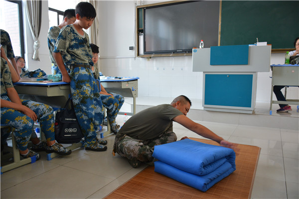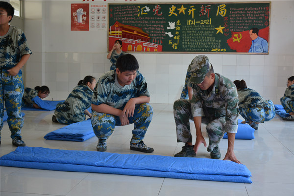 为加强精神文明宿舍建设,有效督促、激励广大同学营造良好的生活环境,养成良好的生活习惯。各班级教官在教室指导“豆腐块”被子的叠法,蹲下、铺平、压实、翻折、抠角、捏线,教官们熟练细致的手法深深震撼着同学们的心灵,教导着同学在生活学习中也要养成精益求精的工匠精神。