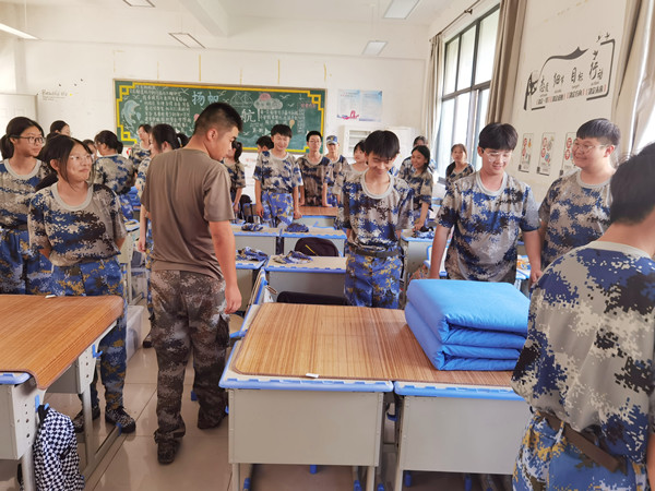 5:30~6:20整理内务;6:20~6:40晨检进教室;6:40~7:40集合就餐;7:40~8:30队列训练;8:30~9:15开营仪式;9:15~10:00队列训练……时间紧紧衔接,行动环环相扣。是的,迎着九月似火的骄阳,一年一度的军训又拉开了序幕。