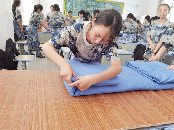 队列训练、叠被子和唱红歌是军训的常规项目。立正、稍息、跨立、停止间转法、敬礼、礼毕、行进、立定、蹲下、起立、脱帽、戴帽……兵之初,从队列训练开始。把被子叠成“豆腐块”是内务训练的关键,教官们认真演示,同学们惊叹不已。队列训练之余,同学们唱起了红歌,《强军战歌》、《文明礼貌歌》是必选曲目,铿锵的旋律在系部和操场久久回荡,成了汗水里的一抹调味剂。