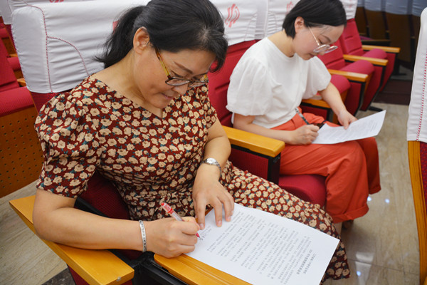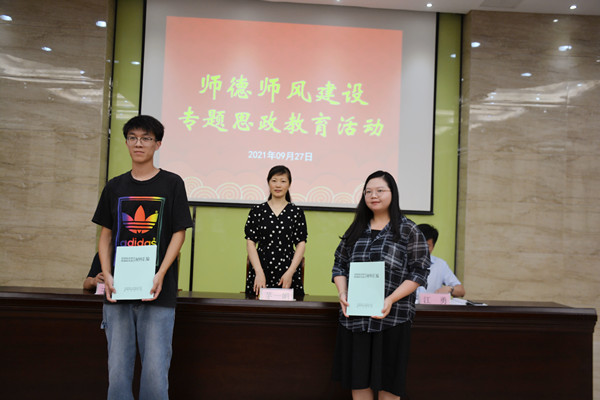 学校还为新教师精心准备了师德师风提升能量包,财贸系胡航玲作为新教师领取了这份专属的贴心礼物。最后,全体教师在《江苏省海门中等专业学校2021学年度师德师风承诺书》上郑重签名。